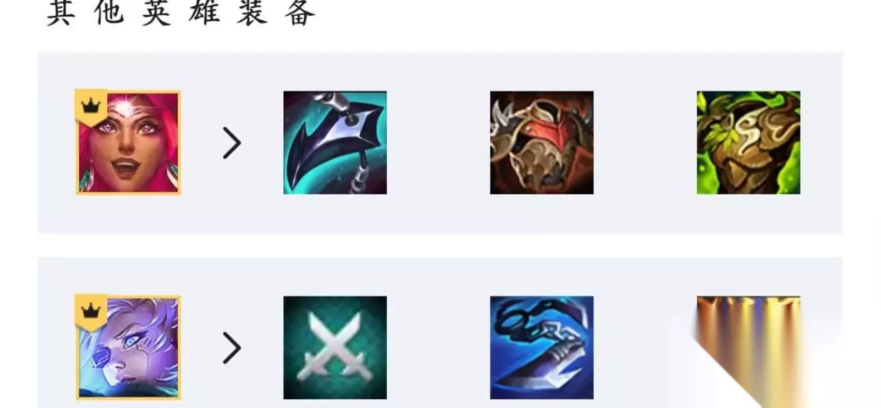 4、其他英雄装备:尼菈的装备是巨龙之爪、反甲、狂徒,寒冰的装备是决斗大师纹章、巨杀、电刀,如下图所示。