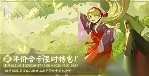活动时间: 2020年8月27日12时 - 9月2日23时59分 活动内容: 在活动期间,客人们可以半价合成卡牌3次。 享受半价的卡牌范围:在经典、不夜之火、月夜幻响三种秘闻卷中所有式神的非异画卡牌。(不包含跳跳妹妹) 御札消耗: SSR卡牌:2400御札 SR卡牌:475御札 R卡牌:47御札 小编提示: 这次的合成优惠获得还是很值得参与的,大家可以通过这次活动获得更多合成卡哦。