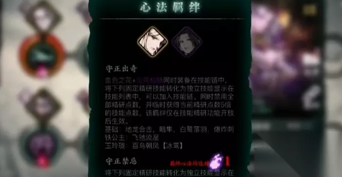 守正出奇羁绊是一种特殊的心法组合机制,通过血色之花与生死相随两枚心法激活。该羁绊的核心功能是将部分技能的精研形态转化为独立技能,使玩家可以在同一技能链中同时使用原始技能和精研后的衍生技能。这种机制打破了传统技能链的限制,为战斗带来更多战术可能性。血色之花作为十一人阁级别的稀有橙色心法,本身具备强大的单卡实力,其关联技能释放时会产生刀刃与枪械的双重攻击,附带定身及降防效果。
