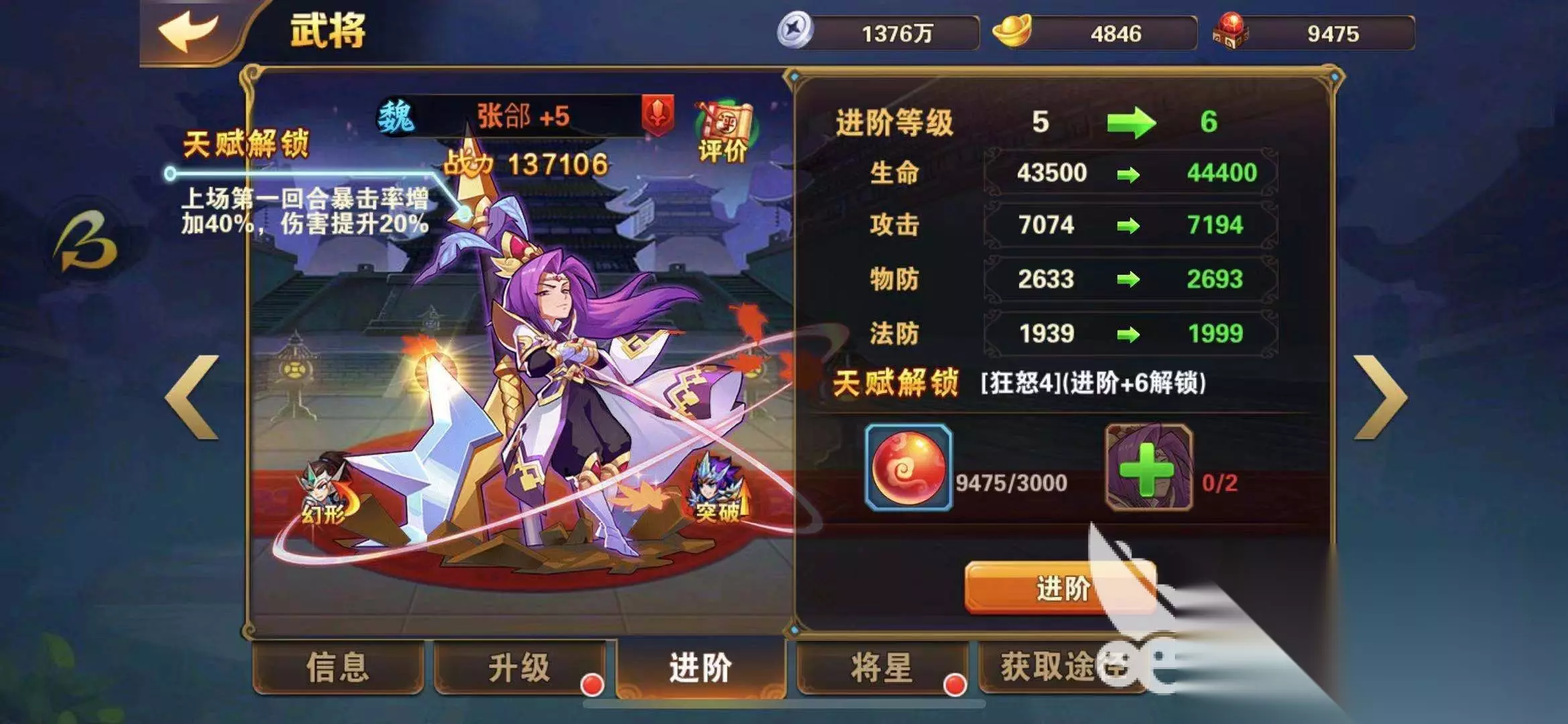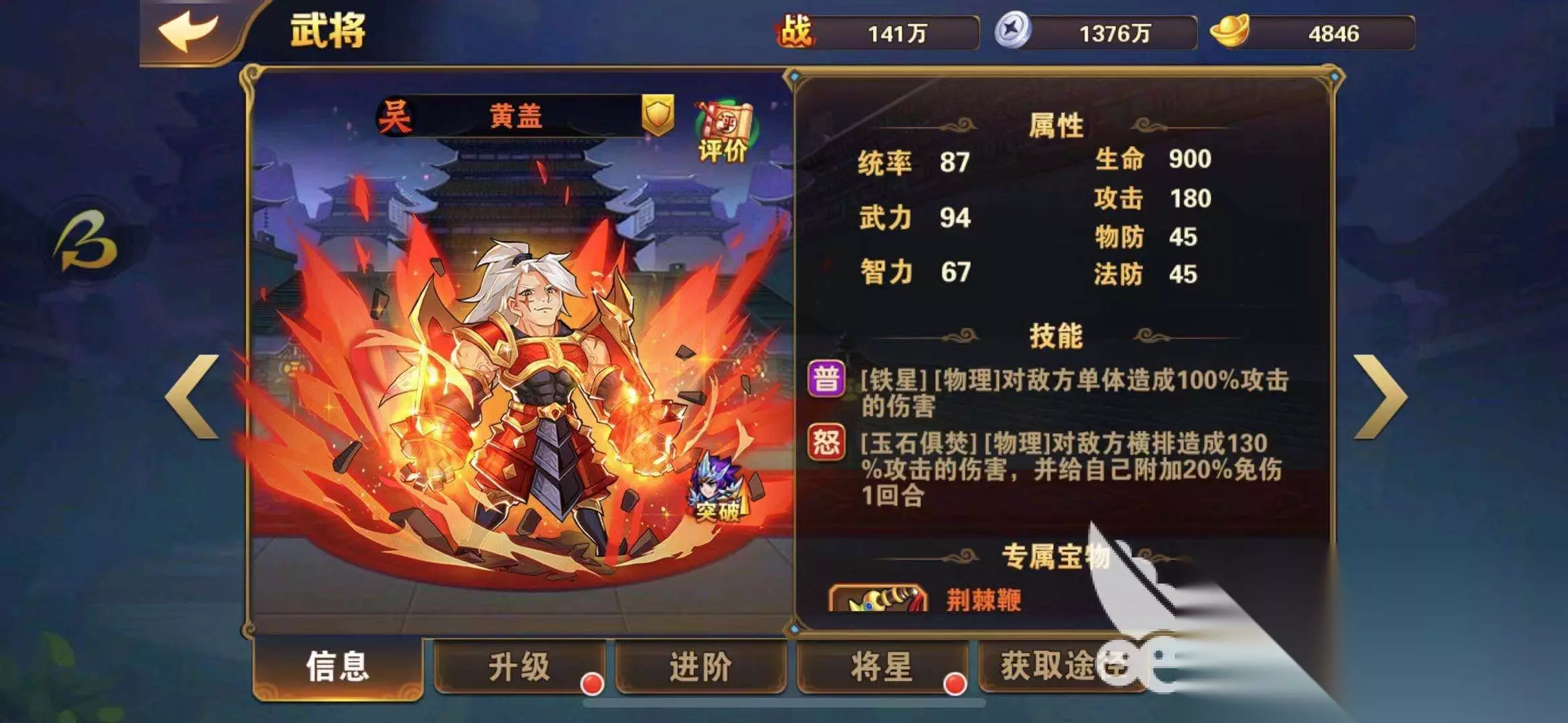 二、提升自己的武将级别和阶数 智取荆州不是PVE的战斗模式,是随机匹配的现实里面的玩家,能力是比较强的,想要战胜他们玩家就必须把自己的武将进行升级,让自己的战斗力变得更强,这样才能够打败其他的玩家,玩家要在酒馆里面获取武将卡,然后通过商店购买和副本扫荡获取到足够的进阶丹和突破丹,然后给自己的武将进行进阶和突破,增强自己的战斗能力,才能顺利的打过更多的关卡。