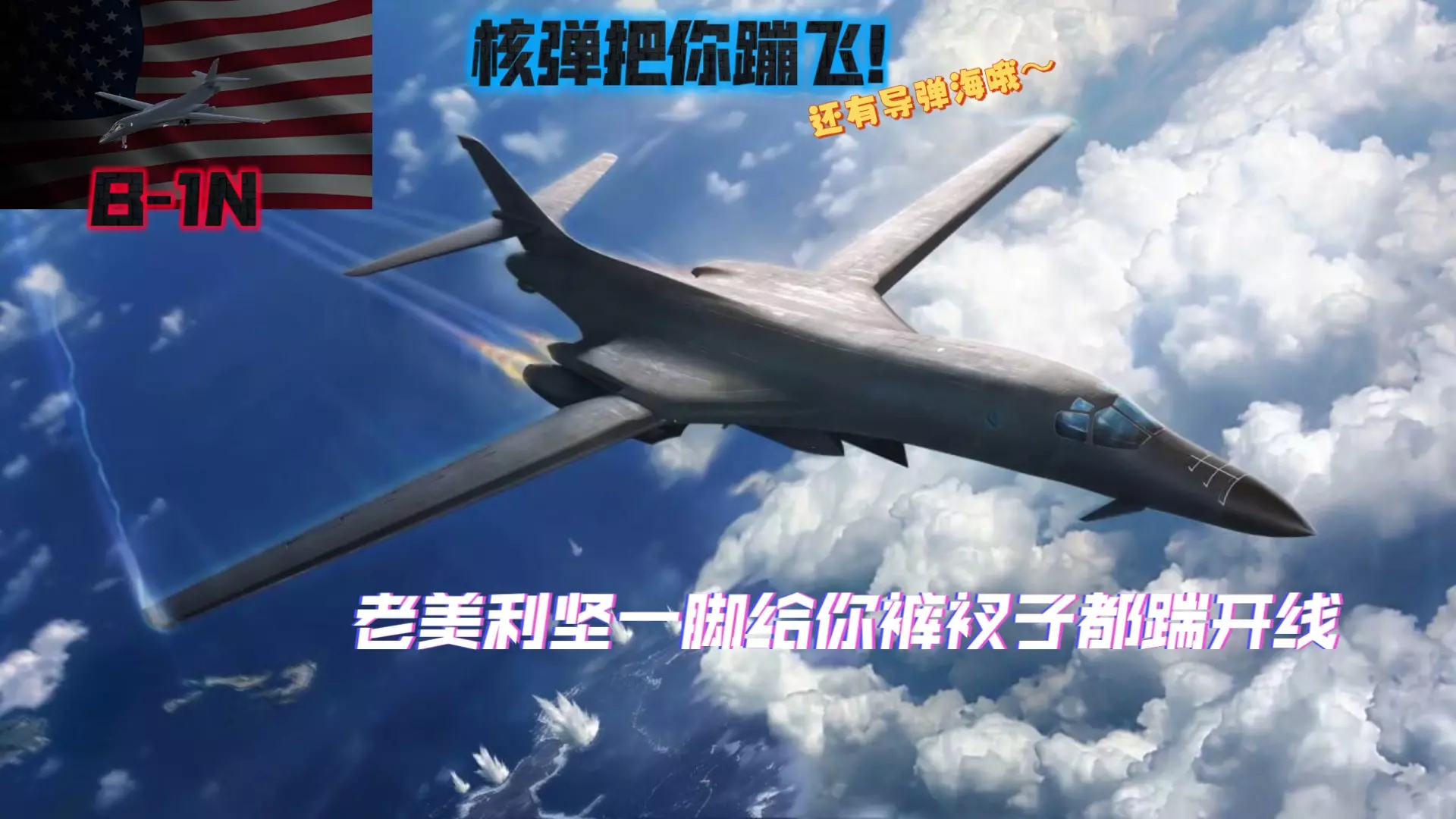 这是《现代战舰》国服的B-1N“枪骑兵”测评,该战机是国服深海寻宝活动赠送的,它可单轮发射大量导弹,但导弹密集,易被核防这类AOE防空手段全摧毁,也易被热诱干扰。