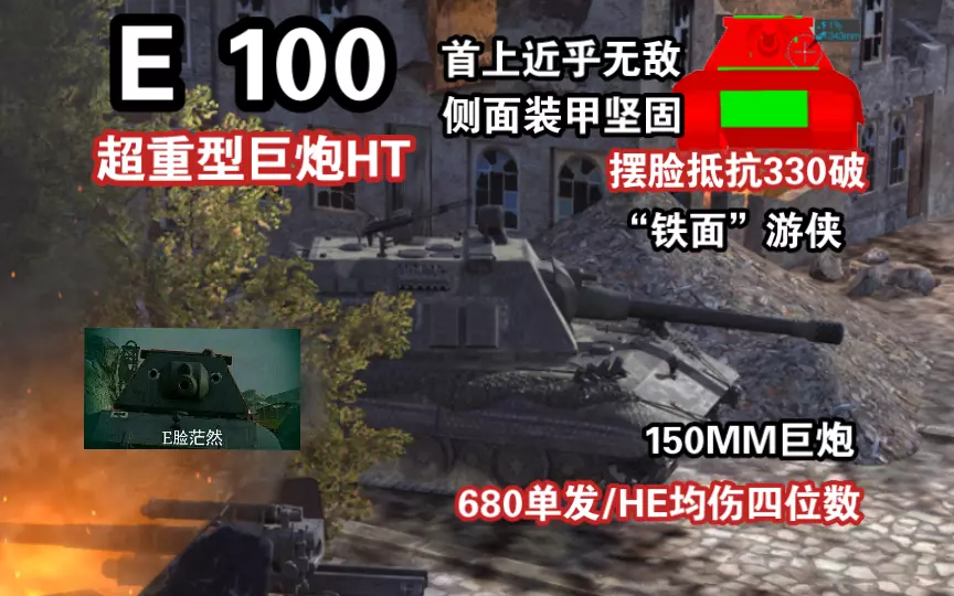 加强炮塔装甲以后,很多9级车包括10级车都已经很难击穿加甲的摆脸E100了 在此之上,E100还有着680的十级HT最高单发…虽然150炮装填被砍导致落单超级难…