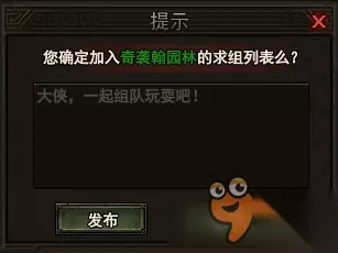 n也可以发布求组,寻找其他玩家一起进入副本,若有玩家邀请组队,则会在游戏界面下方出现组队旗帜,接受即可;