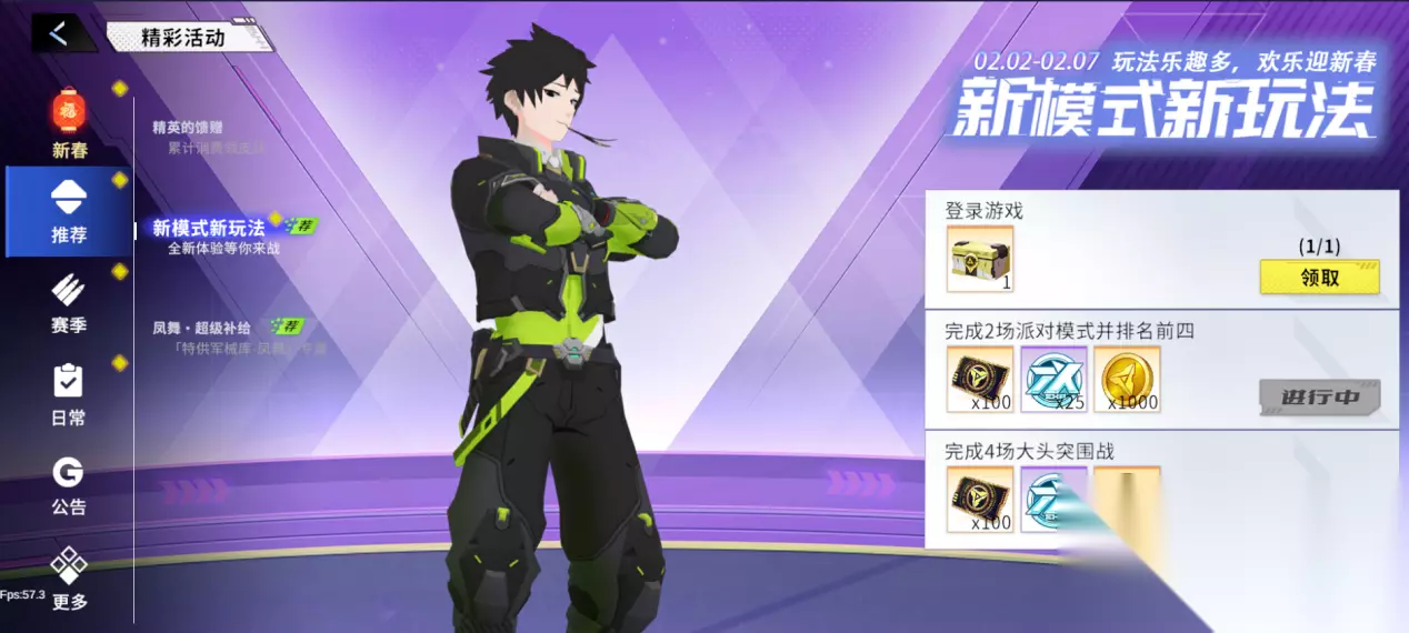 6、新模式新玩法 活动时间:版本更新后-2月7日23:59:59 活动内容:活动期间,完成新模式【派对模式】、【大头突围战】相关任务,即可领取奖励。