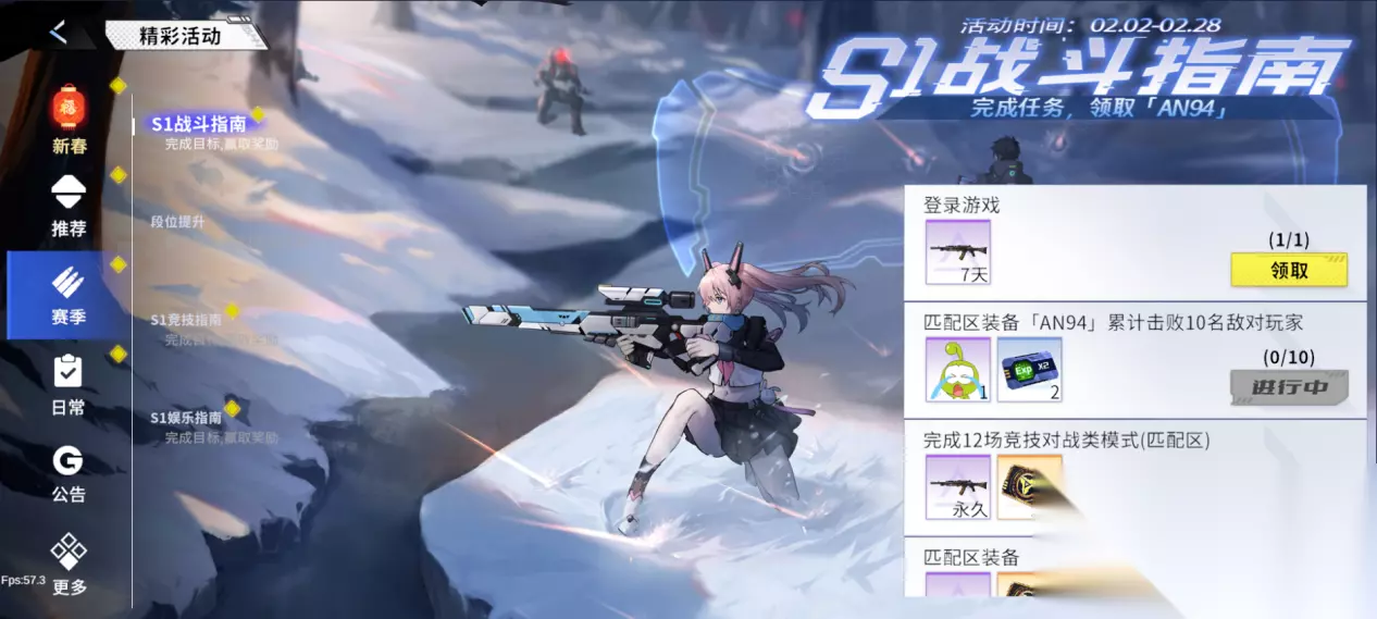 7、S1战斗指南 活动时间:版本更新后-2月28日23:59:59 活动内容:活动期间完成S1战斗指南,可领取奖励包含主武器「AN94」、武器皮肤「AN94(红)」、表情-哭哭、补给黑卡等奖励。