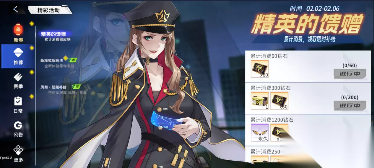 3、精英的馈赠 活动时间:版本更新后-2月6日23:59:59 活动内容:活动期间,累计消费指定钻石数量,即可领取对应档位的奖励,包含武器皮肤-MP7(红)、补给虹卡和补给黑卡等奖励。