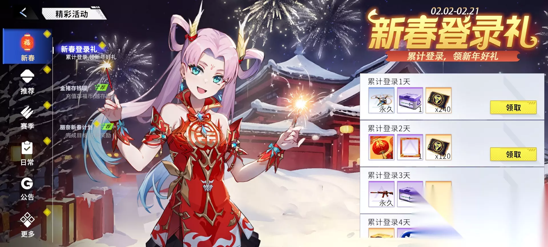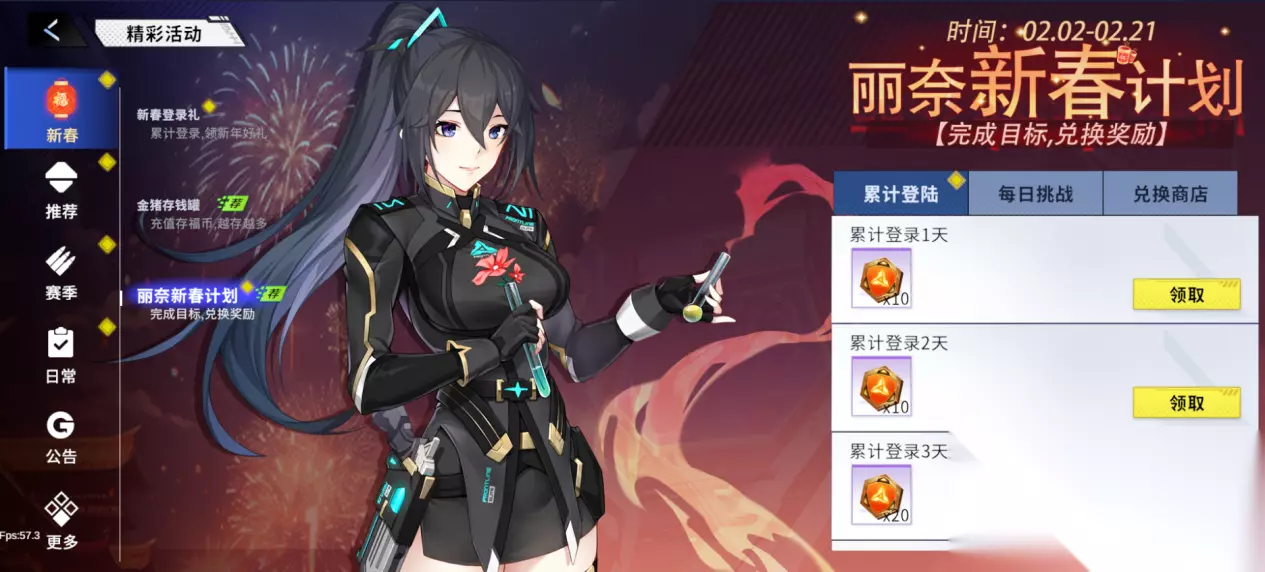 5、丽奈新春计划 活动时间:版本更新后-2月21日23:59:59 活动内容:活动期间,完成丽奈布置的新春计划,领取学院徽章。使用学院徽章,可兑换角色自选箱、补给黑卡、亚卡钛核晶等奖励。