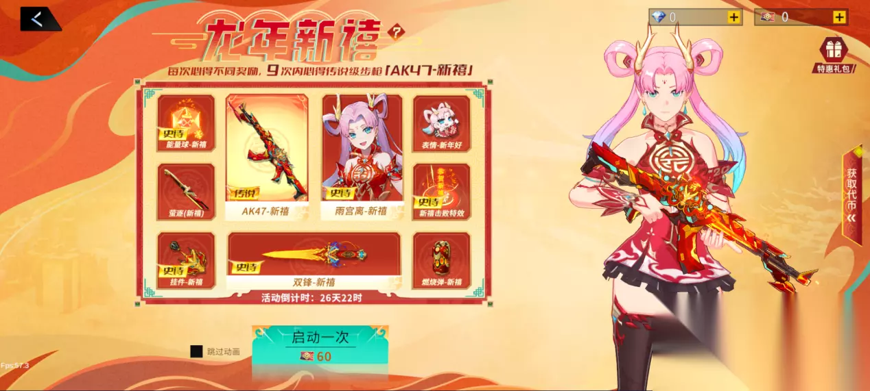 -史诗品质角色:雨宫离-新禧 -卓越品质武器皮肤:萤逐(新禧)、M4A1(新禧)、HILDA73-重锤(新禧)、尼泊尔军刀(新禧) -战备道具:能量球-新禧、燃烧弹-新禧 -个性道具:挂件-新禧、表情-新年好!、击败特效-恭贺新禧 2、龙年限定 磐龙系列(2月7日上线) -不朽品质主武器:M4A1-磐龙 *M4A1-磐龙附带2款武器皮肤:M4A1-磐龙(魔能)、M4A1-磐龙(清辉)