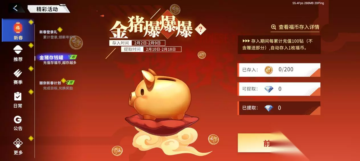 2、金猪爆爆爆 活动时间:版本更新后-2月18日23:59:59 活动内容:活动开启后,存入期间(2月2日-2月9日)累计充值钻石可获得福币。提取期间(2月10日-2月18日)可前往“金猪爆爆爆”活动页面使用福币兑换/取出钻石。 ※最多只能存入200枚福币。更多活动规则可点击活动页面“?”查看。