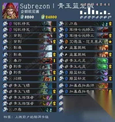 青玉蓝龙贼卡组介绍:暴雪说未来的瓦莉拉将一直是平胸姿态,不知道盗贼新版本会出现怎样的构筑,S君的这个构筑是否能存活下去?