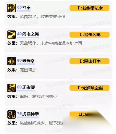 技能进化加点 35级【寸拳】加点:寸劲冲击 攻击失败是冷却时间减2S,范围增加 40级【闪电之舞】加点:追击闪电 移动次数和距离增加,可追踪敌人,未命中则冷却时间3S 60级【碎霸手套】加点:隔山打牛 范围增加,不攻击敌人也能产生冲击波了 75级【虎啸神拳】加点:海市蜃楼 攻击次数-5,获得40s速度增益 80级【无影脚】加点:无影破空踢 追踪敌人,删除部分攻击 技能强化 1、无影脚:技能伤害 2、闪电之舞:技能伤害 3、虎啸神拳:技能伤害