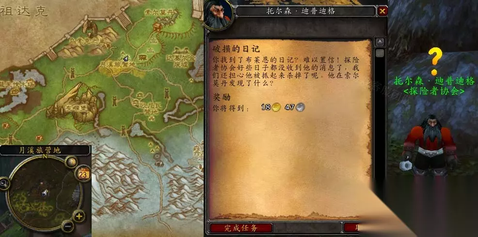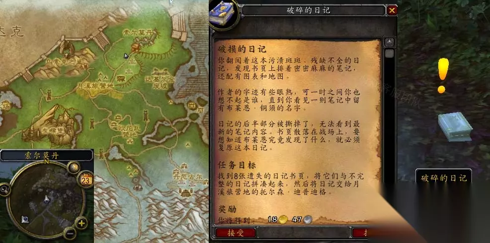 魔兽世界怀旧服WLK破损的日记任务怎么做呢?这个破损的日记任务做法其实并不难,如果大家想要了解这个破损的日记任务具体怎么做可以看看这篇233乐园攻略,相信大家看完就知道了,游戏还是值得大家去体验的。 怀旧服WLK破损的日记任务怎么做 接取等级:73 接取NPC:破碎的日记(灰熊丘陵,索尔莫丹) 完成NPC:托尔森·迪普迪格(灰熊丘陵,月溪旅营地) 奖励声望:无 任务开始: