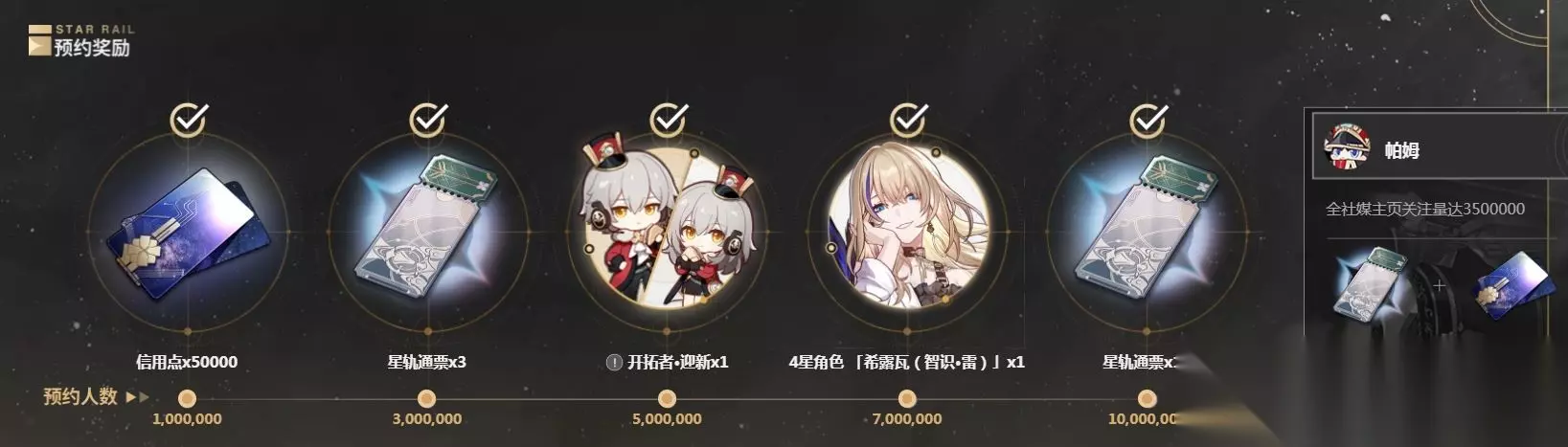 《崩坏:星穹铁道》全平台预约2000万达成!官网设置的预约奖励全部解锁,包括信用点x50000、星轨通票x3、开拓者•迎新x1、4星角色 「希露瓦(智识·雷)」x1、星轨通票x15。