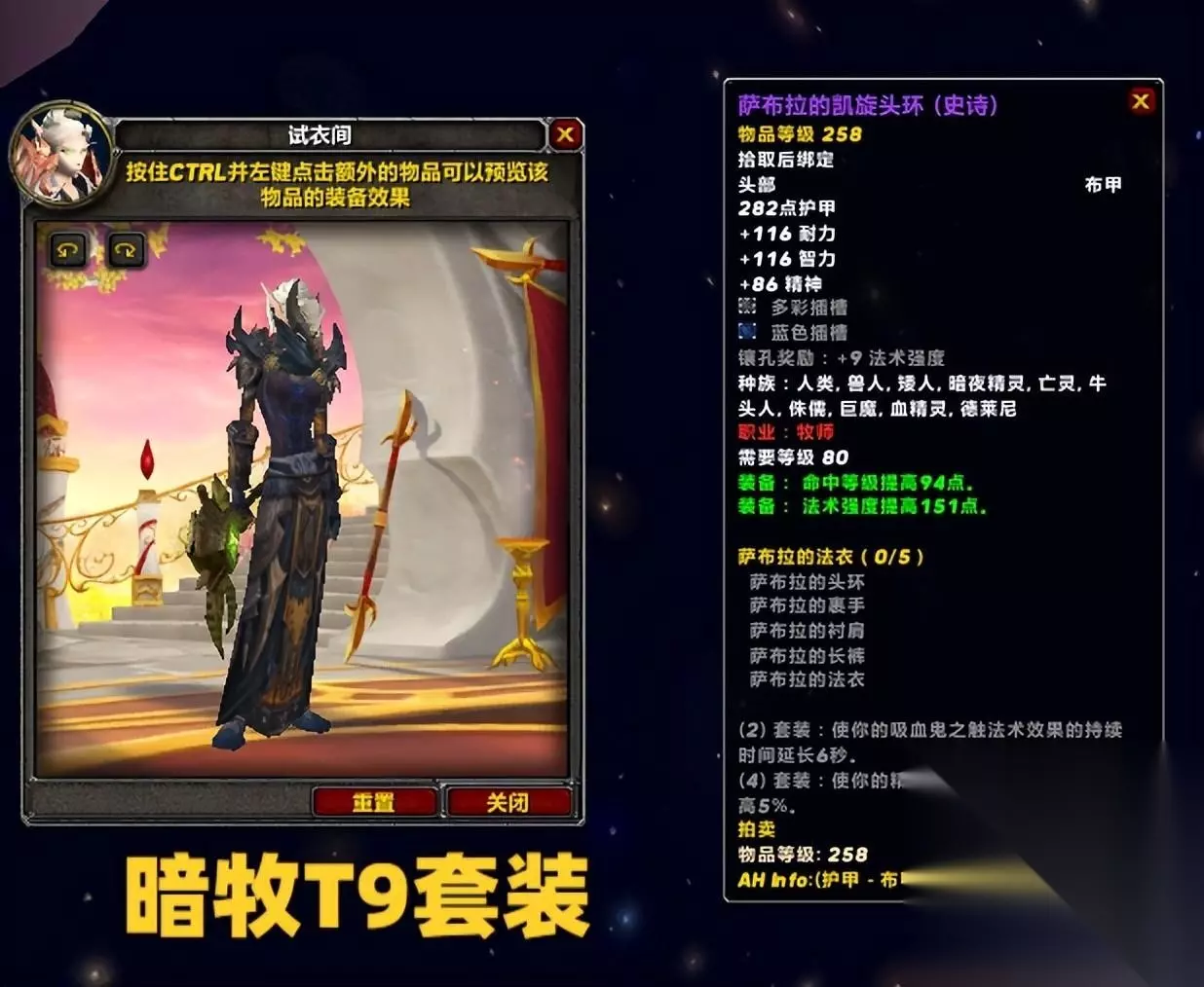 暗牧的T9套装2件特效为吸血鬼之触持续时间延迟6秒,4件特效为精神鞭笞提高5%暴击。总体提升还是不错的,不过P3戒律牧那么强,还有补贴,并不建议玩暗牧。毕竟暗牧的成本很高,伤害却非常低。 以上就是所有DPS职业T9套装的价值了,其中有3个专精是无需4T9的,分别是惩戒骑,潜行者以及增强萨,而鸟德可以看情况穿2T8加2T9的组合,最后再选择入手4T9。