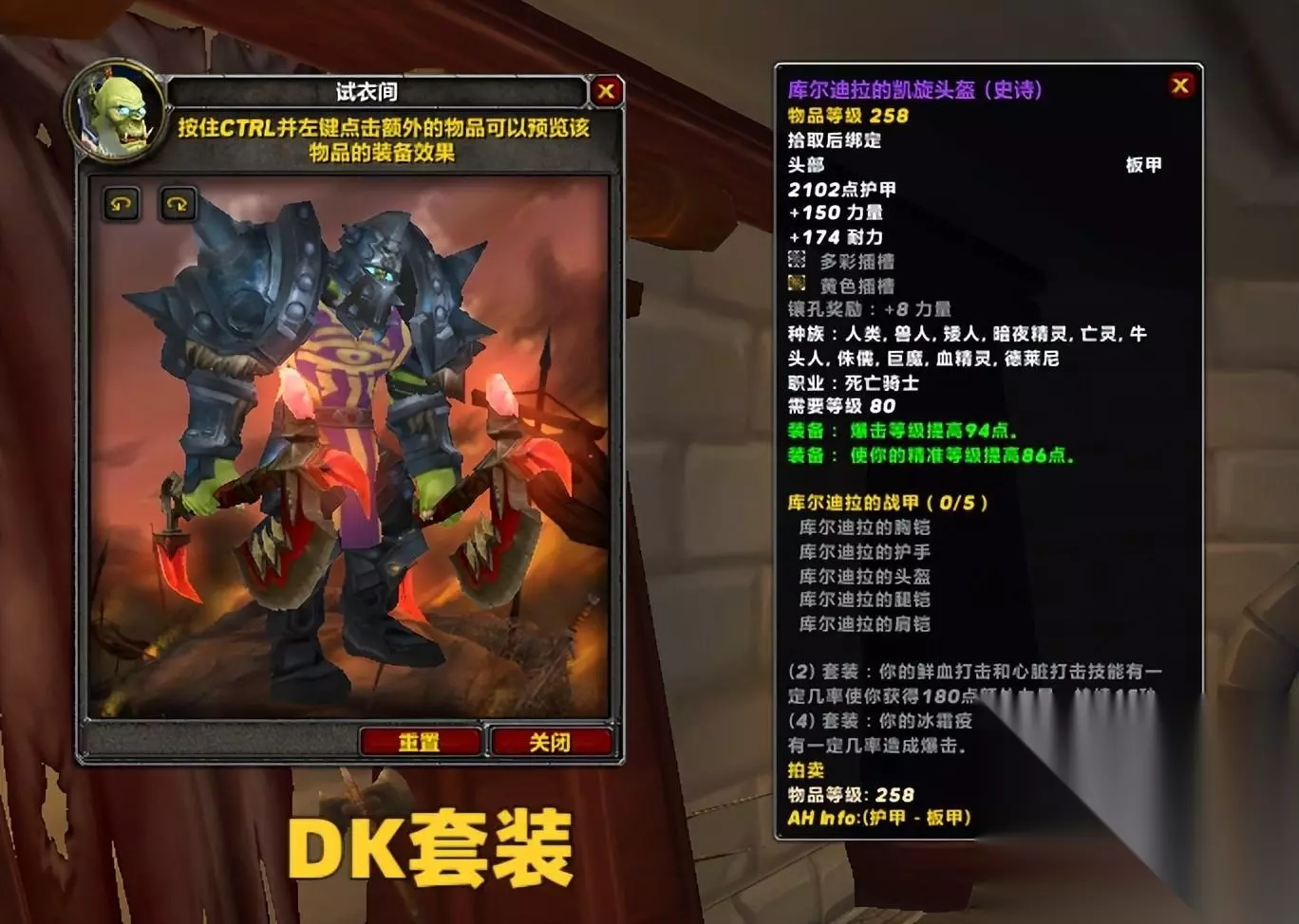 DK的T9套装2件特效为鲜血打击和心脏打击有几率获得180点力量,持续15秒,4件特效为双病暴击。 力量是DK第一属性,而双病暴击可以大幅提升DK的AOE能力,因此DK的4件套也是必备的。4件套选择头盔,肩膀,胸甲以及头套,裤子可以选择25人双子的升华腿。