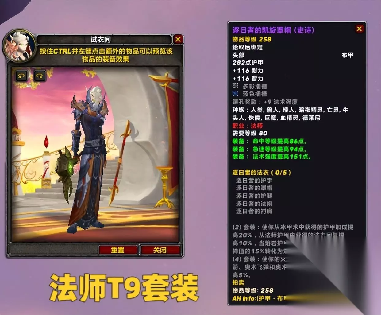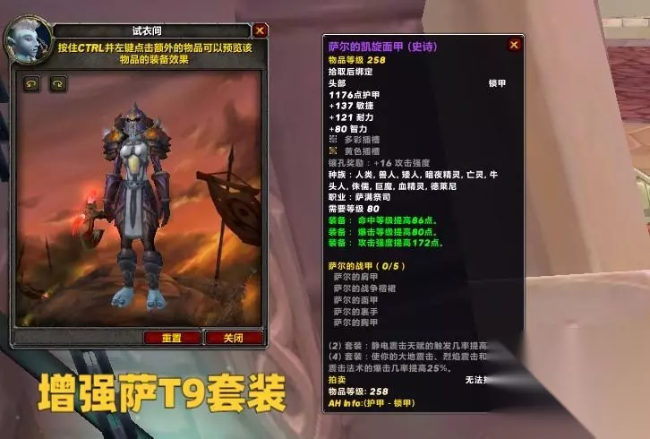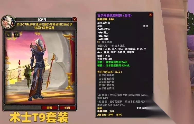 术士的T9套装2件特效为宠物提高10%暴击,4件套为献祭,腐蚀术以及痛苦无常提高10%伤害。 无论是恶魔术,还是痛苦术,T9套装都是必备的,4T9特效可以提升4%-5%的单目标伤害,提升5%以上的多目标伤害。配装方面可以考虑不用胸甲,直接做裁缝胸甲。
