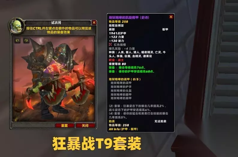 狂暴战的T9套装2件特效为狂暴姿态提高2%暴击,战斗姿态提高6%破甲,4件特效为猛击和英勇打击提高5%暴击。 很显然,狂暴战的T9套装特效是非常优秀的,并且T9套装的常驻属性也附带大量的破甲。4件套选择头盔,肩膀,胸甲以及裤子,手套可以选择25人小强的皮甲手套。
