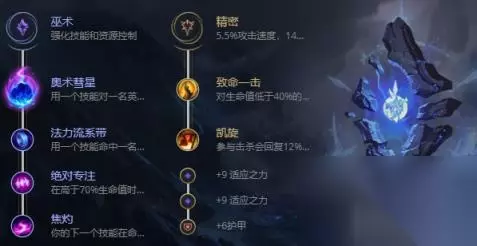 2、出装思路:大头神话推荐选择兰德里的苦楚,可以提升法强、法力值和急速,还能在攻击敌人的同时削减敌方法抗,出完神话后选择恶魔之拥、莫雷洛和长牙提升法强和生存能力。 3、符文选择 主系:巫术(奥术彗星、法力流系带、绝对专注、焦灼) 副系:精密(致命一击、凯旋)