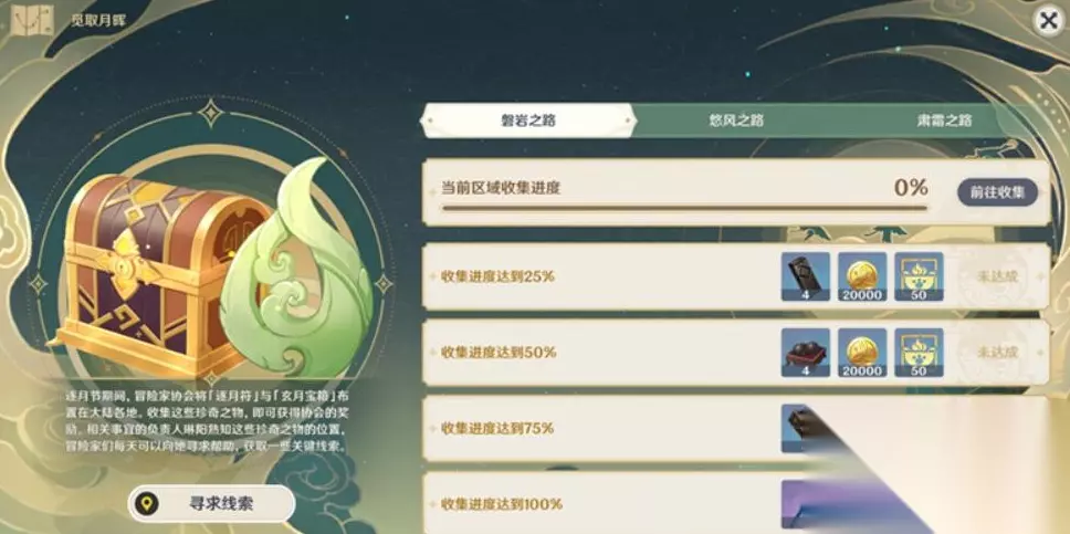 3、完成任务后便可获得宝箱以及逐月符道具奖励,当玩家积累到一定的逐月符后,可以在活动商店中兑换原石、摩拉、经验书、天赋材料等等诸多奖励; 4、并且当玩家的收集进度达到了一定的进度后,还可以在活动列表里领取额外奖励。