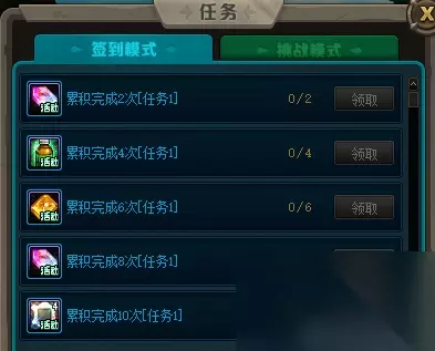 2、签到模式任务首先,累计通关“2、4、6、8、10、11、12、14、15、16、18、19、20、22、24”次签到模式,可领取对应奖励。其次,累计消灭“200、400、600”只怪物,可领取对应奖励。