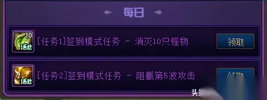 活动奖励一览 通关小游戏,完成“每日任务、签到模式任务、挑战模式任务”,领取对应奖励。 1、每日任务签到模式下消灭10只怪物,领取“树叶”,可“升级训练所”或“雇佣佣兵”。签到模式阻击5波攻击,领取1个装备提升礼盒。