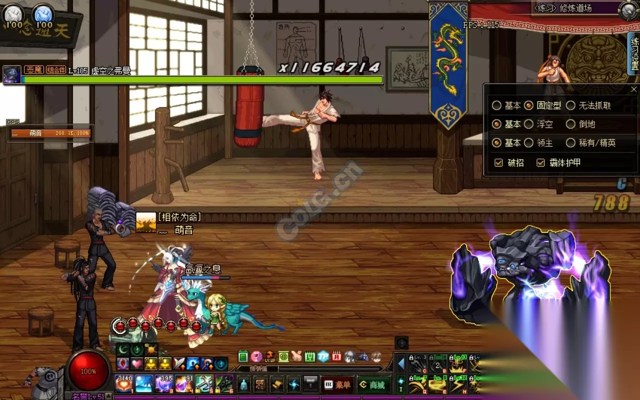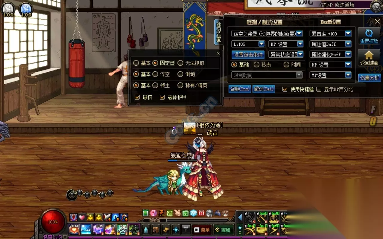 修练场设置,满暴击避免暴击不满造成的影响,怪物选择了105级沙包,固定破招