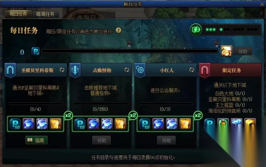 这个就是大家轮流使用自己输出角色,带其他的角色进行过图,从而可以保证小号也可以打高级副本,目前来说主要是在流放者区域/未央区域/高级图,个人建议是找到固定组每天一个时间点去刷,不然容易遇到骗子。 每日/每周