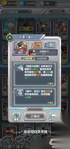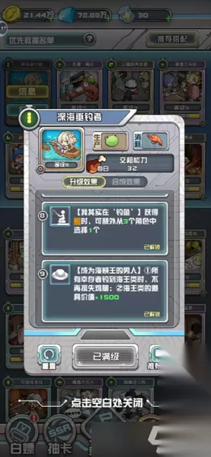 核心异能:返现(重中之重),来都来了,概率10% 玩法解释:钓鱼1技能扣除10%的鸡腿,通过返现15%,实现无脑利滚利,虾头增加额外钓鱼生产,10%概率再钓海王,再扣10%。