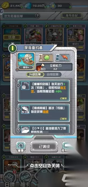 玩法注意:钓鱼卡升级满8级即可,如果升级到9级,可以通过重置回到八级,九级失去海王类-10%,返现15%,钓鱼流派的核心技能就报废了,如果不想重置,在游戏内注意不要合成五星,激活9技能即可。但如果又想吃五星租金,又想爽钓的话,8级为最优解。