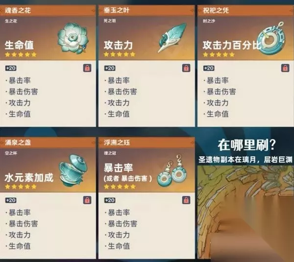 圣遗物这里推荐四余响,不想刷的也可以用四水套,或者四决斗,也可以用二加二。 圣遗物主词条选择,攻击沙,水伤杯,暴击/爆伤头(根据自己的想要去选择)