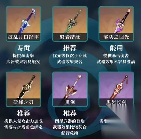 武器推荐 武器这里推荐专武,这一次绫人的武器和薙刀一起复刻,粉球多的旅行者可以尝试一下(也可以等海灯节,护摩,若水更香一些,抽哪个都不亏),但是喜欢的也可以抽,其次绿剑,雾切也可以 ,要是都没有的话就用月卡武器黑剑即可。