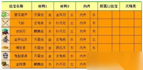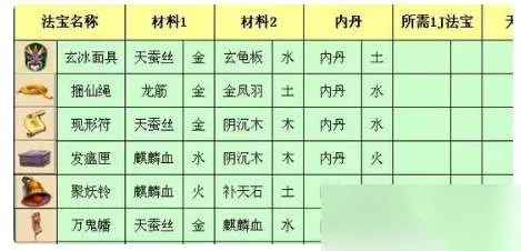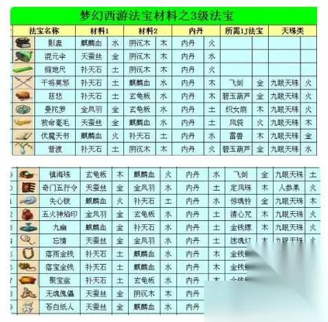 2、特殊的2级和3级法宝会额外增加部分材料,如:1级法宝、三眼天珠、九眼天珠、人参果等。