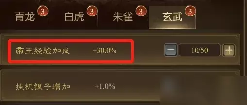 玄武系:加帝王经验加成、挂机银子增加、控制时间增加、受控时间减免;