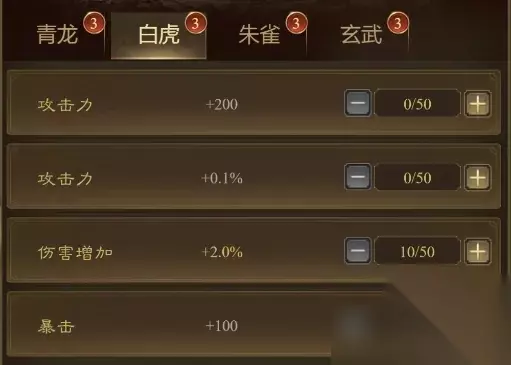 白虎系:加攻击力、伤害增加、暴击;