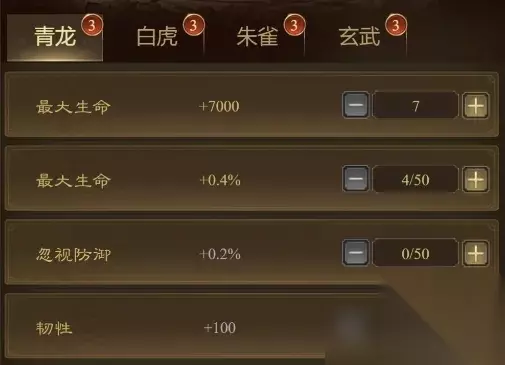 2、帝王属性分青龙、白虎、朱雀、玄武四大系,每个系的效果都不一样。 青龙系:加最大生命、忽视防御、韧性;