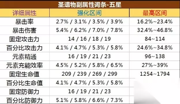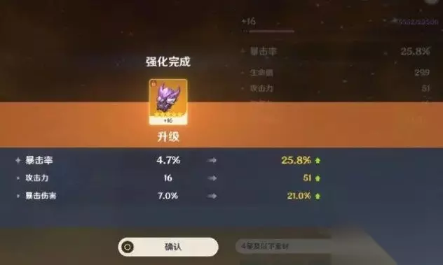 3、强化石等级:每次强化的具体数值还受到强化石等级的影响。在某些情况下,强化石的等级会影响强化后的属性数值范围。 4、特定属性的强化情况:有些特殊属性的强化数值是有固定范围的,例如攻击力百分比属性,每次强化数值大约在4.1%至5.8%之间;双暴属性(暴击率和暴击伤害),每次强化数值在2.7%至3.9%之间;元素精通,每次强化数值在16至23之间。 总结: 总的来说星级越高增加的越多,五星的圣遗物强化加成大。旅行者们要多多加油,希望大家都能抽到高级的武器。