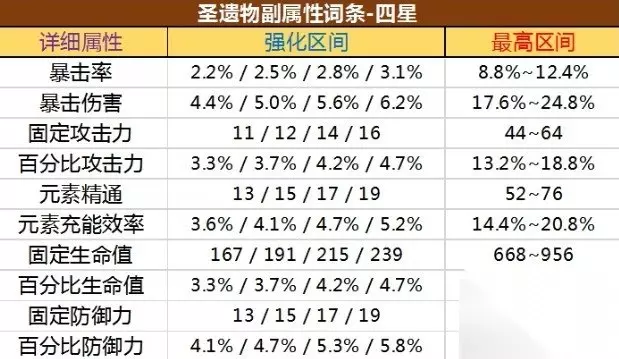2、副属性数量和强化机制:每件圣遗物初始都有不同的副属性数量,这些副属性是随机的。当圣遗物升级到一定级别时,会发生特定的强化事件,例如三星圣遗物在+4时会随机强化一条副属性,而四星和五星圣遗物则在+4时随机强化一条已存在的副属性。此外,每次强化还会在副属性中选择一个数值进行强化,这个数值是从副属性中所有可能的数值中进行随机选择的。