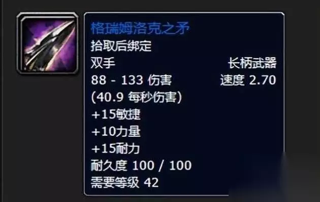 如果轰石之锤是战士的心头所好,那么这款长柄武器格瑞姆洛克之矛绝对是猎人玩家魂牵梦萦的极品武器了。力量、耐力以及高额的敏捷加持可谓是三花聚鼎脚下生莲输出无敌啊!猎人绝对是毫无抵抗力的存在。如果你60版本玩过猎人就应该知道他的意义。 三:加加恩的火枪