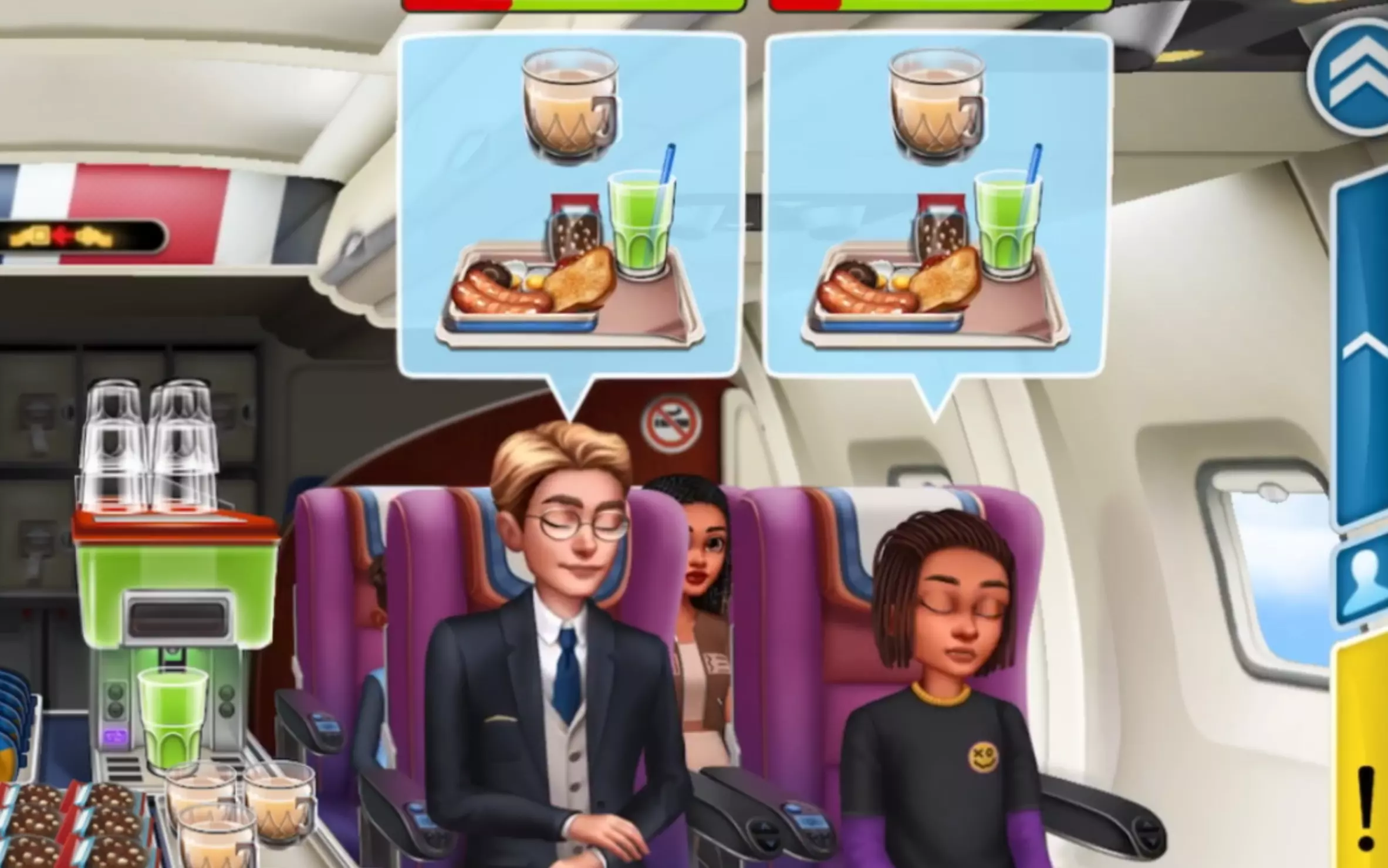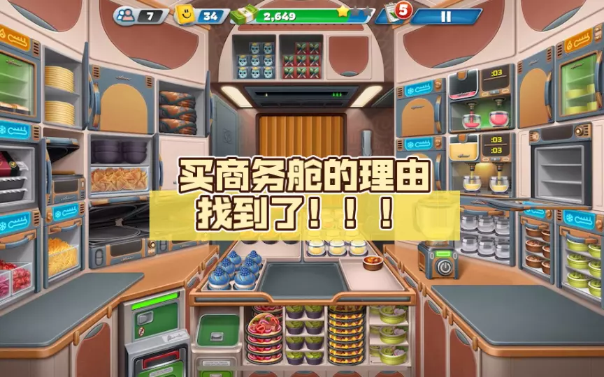 这是模拟经营游戏《飞机大厨》的游戏内容展示,呈现了游戏里在飞机客舱为乘客准备并配送餐食的玩法,还给出任务建议:做任务别选太靠后的关卡,展示了游戏内的厨房备餐区、客舱服务等场景。