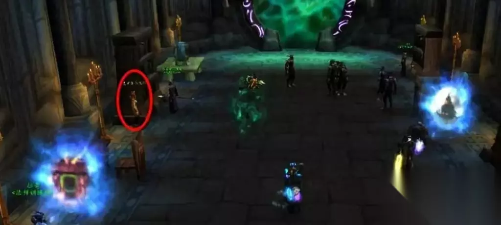 到达主城传送位置后,联盟方面前会有两个传送门,左边是到地狱火半岛,右边是回伯拉勒斯,其实这里还隐藏着另一个传送门,就是这个黄名NPC,青铜龙“克里多尔米”。部落方的这名青铜龙NPC名为“齐拉多尔米”则位于酋长大厅,王座的左侧。