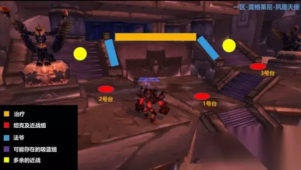 [幻影分身]---当斯克拉姆生命值降为75%、50%、25%时召唤2个分身。分身拥有同样的技能,具有更高的攻击力,但额外承受200%伤害。 由于欧洲某服的奥爆伤害实在太高了,绝大多数团体一般采用吸蓝打法。国服若奥爆伤害可以接受,可采用正常打法。无论哪种打法,站位基本都差不多,如下图所示。