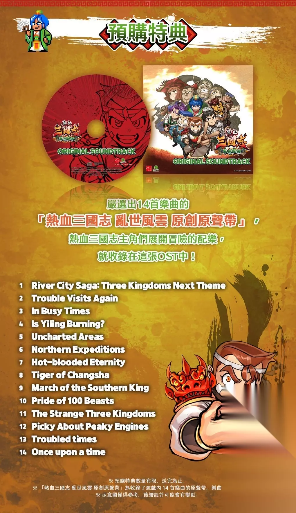 ※ 预购特典数量有限,送完为止。 ※ 「热血三国志 乱世风云 原创原声带」收录了 14 首游戏乐曲,乐曲数量可能会变更。 ※ 示意图仅供参考,后续设计可能会有变动。 《热血三国志 乱世风云》故事后半部介绍 第三章「山雨欲来」 关羽为了牵制曹操,独自治理荆州。他以压倒性的武力攻打襄阳的曹仁,终于拿下了荆州。但不能高兴得太早,魏国军师司马懿施计洗脑了同盟国吴国的孙权,魏吴组成同盟军袭击了关羽,荆州沦陷。在鲁肃的帮助下关羽侥幸逃过一劫。刘备对吴国的背叛勃然大怒,但在关羽和鲁肃的说服下,决定解开孙权的洗脑而行动。
