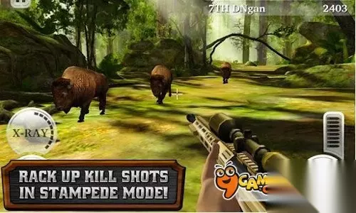 进入到游戏后,游戏中是可以选择场景的,除了第一个场景是已经免费解锁,其余后边的场景都是需要解锁或者直接用金币购买才可以进入的。我们能够免费进入的场景是一片茂密的丛林,我们的猎物是鹿。在开了几枪击毙了几头鹿之后,感觉其效果还真的非常逼真,模拟得相当真实,就像是我们在平时看电视或 电影中人们狩猎的场景差不多,狩猎讲究的也还是快准狠。