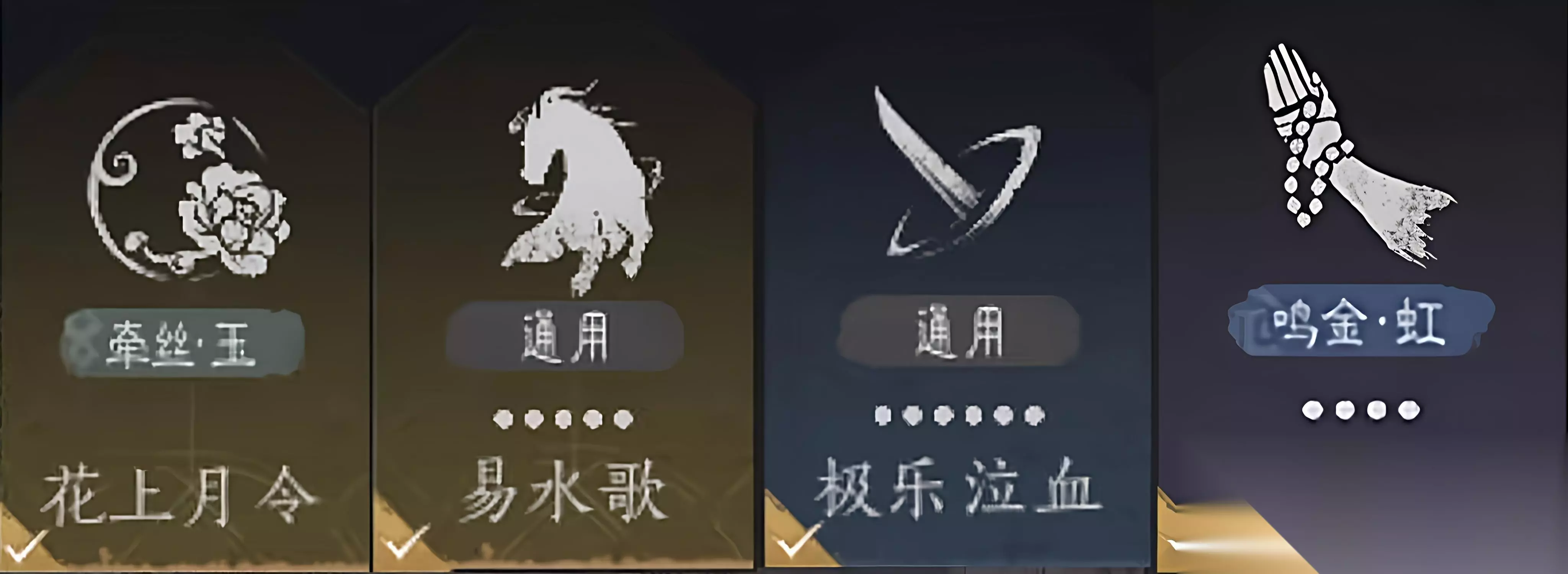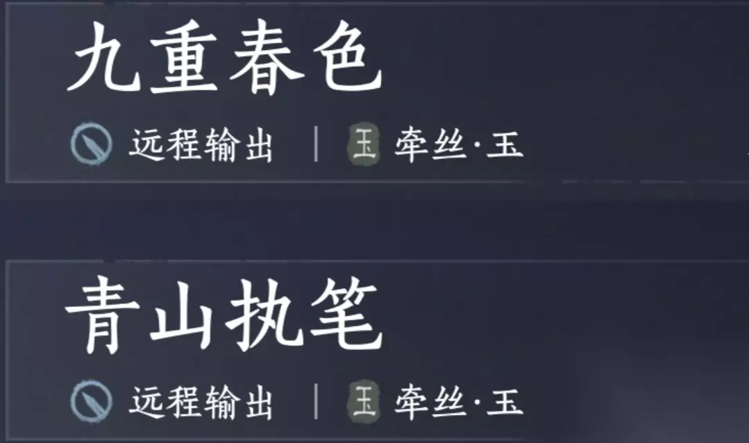 九重春色+青山执笔 推荐套装:飞隼套、时雨套 推荐心法:花上月令,易水歌,威猛歌,极乐泣血 PS:六重“征人归”可替换“威猛歌”