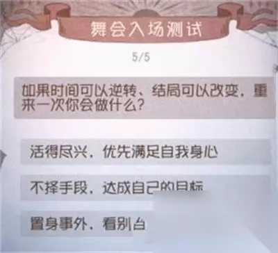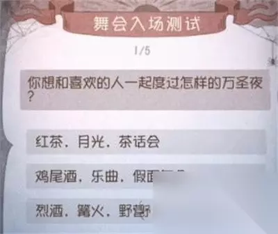 第五人格舞会入场测试题目介绍 1、问题:你想和喜欢的人一起度过怎样的万圣夜? 参考答案:鸡尾酒,乐曲,假面舞会。