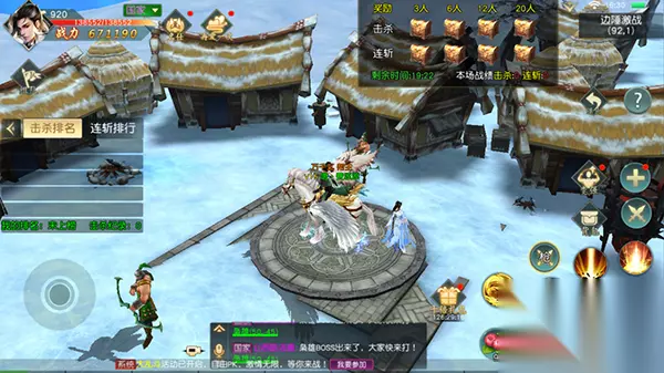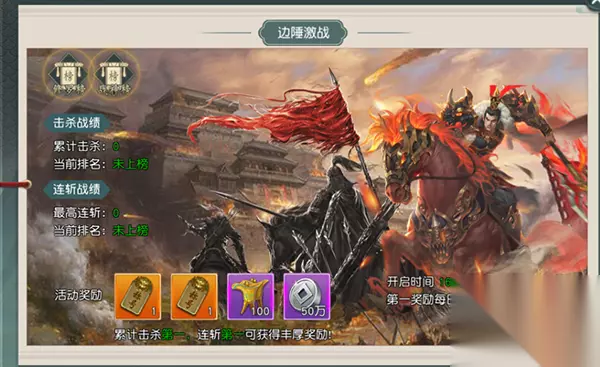 2)边陲之战 1.开启时间:每天16:30-16:50,21:30-21:50; 2.玩法说明:战场根据国家分为两个阵营,活动开启后玩家进入战场与敌方限时战斗,根据战绩获得奖励; 3.活动开启后,点击【进入战场】即可进入边境战场,畅快战斗;死亡后60秒内再被击败不计数;角色被击败后,连斩数归零;战场中央刷新首领,击败后掉落银两增益,拾取后玩家可获得持续海量银两;