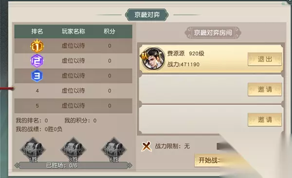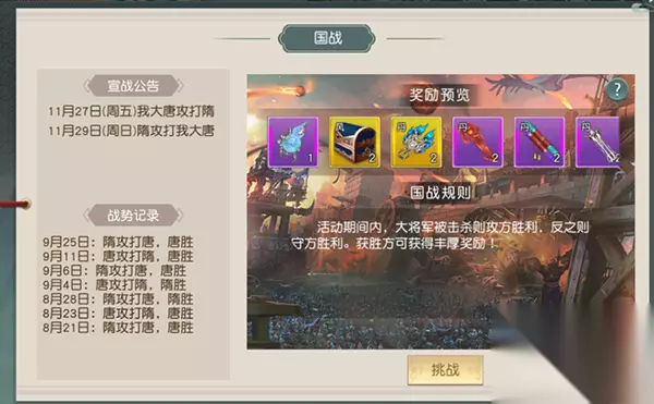 4)隋唐大战 1.开服、合服第1天,每周一20:00-20:20;1转并加入阵营的玩家即可参与; 2.玩法说明:以帮会为单位,通过击败首领、击败敌国玩家获得胜利;地图上每隔一段时间会刷新一批宝箱,采集宝箱可获得奖励; 3.活动开启后点击【参与活动】即可进入楚汉战场,参与活动。 5)京畿对弈 1.开启时间:开服第2天,每周二20:00; 2.玩法说明:3对3,需要组队前往战场,每场战斗限时5分钟,占领旗帜获得粮草,粮草率先到达1000的团队获胜;活动结束时,根据本场积分排名进行奖励; 3.胜利累计达到1、3、6场,分别可额外领取对一个的宝箱奖励; 4.活动开启后点击【进入活动】进入到京畿对弈界面。 ²界面左侧显示本次活动积分排行,下方显示胜利次数及奖励及个人的积分、排名及战绩; 右侧为创建的房间,队长可进行邀请帮会成员和好友;当人员满后,点击开始匹配,匹配到队伍后即可进入到战场界面。