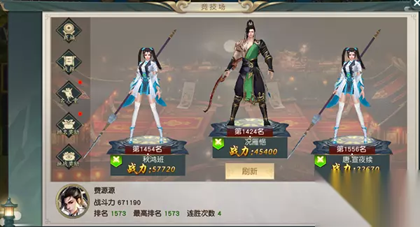 1)竞技场 1.开启时间:全天; 2.玩法说明:击败排名比自己高的玩家即获得对方排名,排名越高奖励越丰厚; 3.左侧显示功能按钮,右侧显示3个排名比自己高的玩家模型,点击【刷新】按钮随机更换3个角色,点击玩家模型即进入竞技场景,击败玩家获得奖励,失败排名不变; 4.点击【商店】按钮进入声望商店,消耗声望值购买符文技能和心法;点击【战报】查看挑战和被挑战记录;点击【名人堂】可以查看前3名玩家,每天00:00更新,每名玩家每天可膜拜1此;点击【排名奖励】可以查看各阶段排名奖励,以及每天可根据排名来领取一份排名奖励;点击【挑战奖励】可以查看和领取挑战奖励,挑战次数越多,可领取的奖励越多,挑战奖励每天00:00更新。 5.下方显示玩家头像、战力、排名、最高排名、连胜以及每日可挑战次数。 6.每天可免费挑战10次,每次挑战会有冷却时间,当冷却时间达到30分钟及以上,则暂时不可继续挑战,等冷却时间结束后可继续挑战,或者消耗元宝直接冷却; 7.挑战次数可消耗绑定元宝购买,根据贵族等级不同,可购买的次数不同;