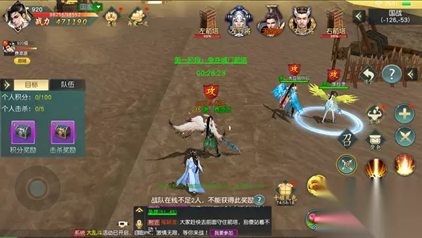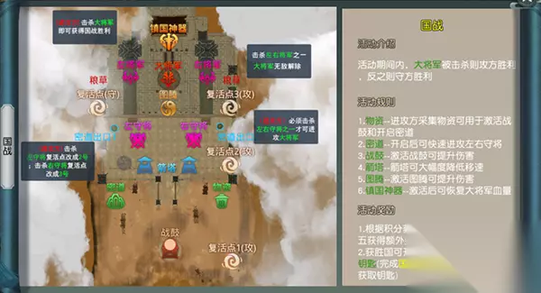 Ø通过主界面-战场-国战,在活动期间,点击进入战场,即可进入到国战地图; Ø在国战地图界面:左侧显示个人积分和击败情况,同时可点击积分奖励和击败奖励查看;右侧上方显示的时守城方箭塔及守城将领,可直接点击自动寻路到其身边,同时可以查看其当前状态; Ø物资:进攻方可通过采集物资,用来激活战鼓和开启密道;密道开启后,可快速进攻左右守将;战鼓激活后可提升伤害; Ø点击右侧的“?”可查看国战具体规则和相应玩法说明等;点击“退出”按钮,可随时离开战场地图; Ø国战结束后,根据积分排名进行奖励发放;