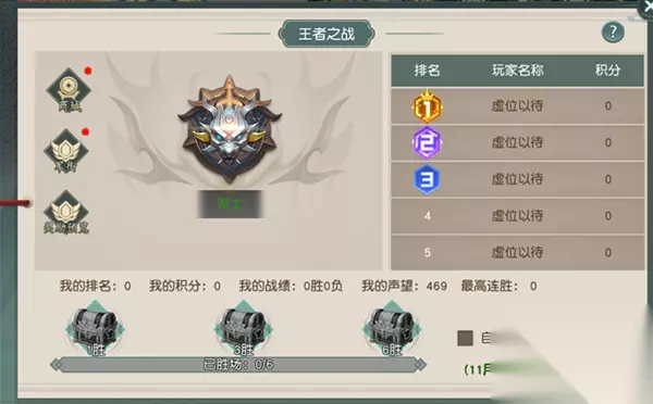 6)王者争霸 1.开启时间:开服第6天,每周六20:00; 2.玩法说明:1对1,每场战斗限时3分钟,战力比拼;点击“开始匹配”(可勾选自动匹配:每次战斗结束后自动匹配下个对手),匹配到对手后进入战斗界面,倒计时结束血量百分比多的玩家获胜;活动结束时,根据本场积分排名进行奖励;累计胜利达到1、3、6场,可额外领取对应的宝箱奖励; 3.右侧显示本次积分排行;下方显示个人排名、积分、战绩及获得的声望值以及自动匹配按钮;左侧显示军衔图标、声望商店按钮,军衔按钮;